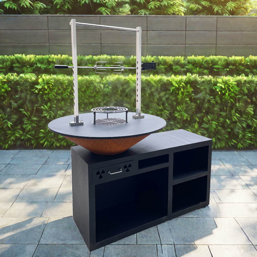 Parrilla redonda para barbacoa. Fabricada en acero Corten de 8 mm de grosor, el cuerpo principal y el brasero presentan un color óxido. Esto significa que no requiere mantenimiento durante toda su vida útil. Esta parrilla está equipada con un cenicero fác